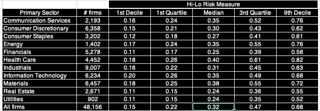 I computed this statistic for each company in my sample, and then the averages across companies in each industry, and it should be lower (higher) for safer (riskier) stocks. Using my global data, this is what this statistic looks like, across sectors: