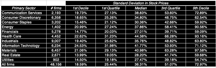2. Standard deviation in price changes: This is a standard statistical construct, and measures volatility in a stock, though it does not distinguish between upside and downside volatility. Based upon the company-specific standard deviations, again averaged out across sectors, here is what the numbers looked like in 2025: