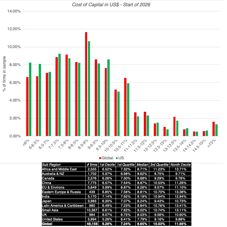In corporate finance and valuation, an undervalued skill is having perspective, a sense of what comprises typical, and what is a high or a low value. It is for that reason that I also compute a histogram of costs of capital of all publicly traded firms at the start of 2026: