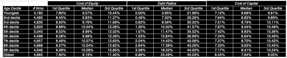 As you can see, there is no discernible pattern on costs of equity, as you go across the age classes. However, as firms age, they do borrow more, partly because their capacity to generate earnings increase, and that does have some impact on the cost of capital, especially with the oldest firms in the market.