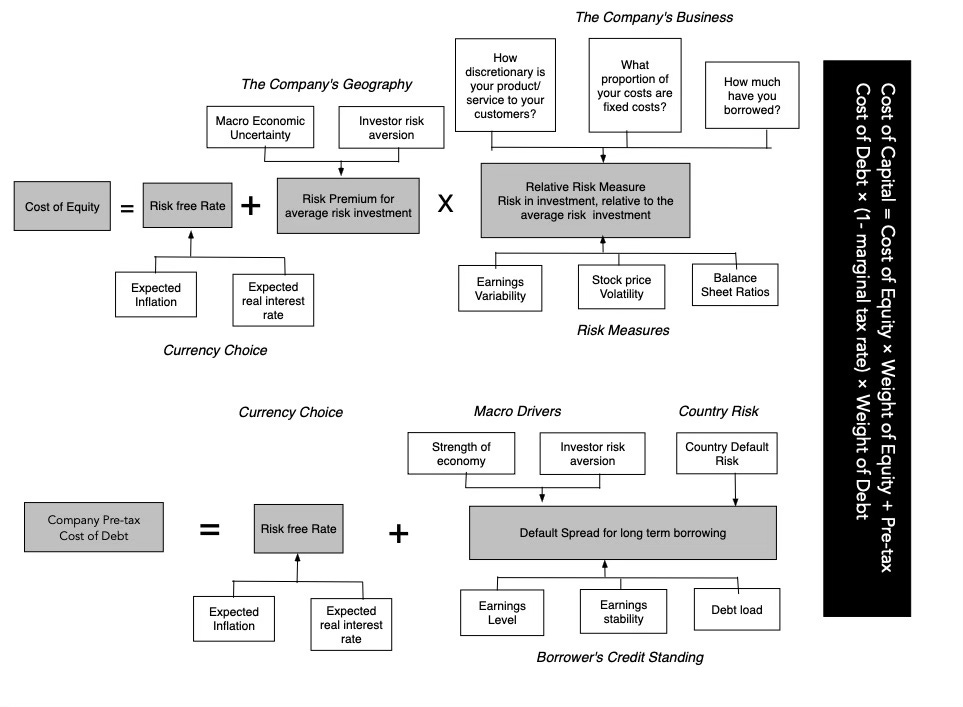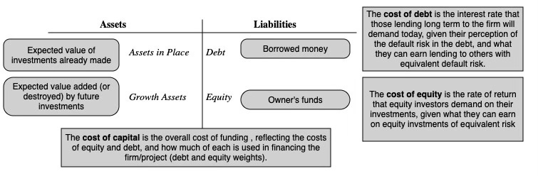 In the context of a business, which raises money from debt and equity, you can look at hurdle rates through the eyes of the capital providers – a cost of equity, capturing what equity investor believers expect to make on other equity investments of equivalent risk, and a cost of debt, looking at what lenders can earn on lending to others with similar default risk: