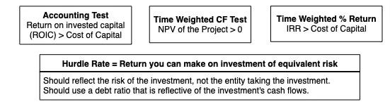 Even as we wrestle with choosing between price and accounting-based measures, it is worth remembering that the end game here is not the risk measure itself, and that risk measures are a means to an end, which is estimating hurdle rates. Hurdle rates come into play for both businesses and investors, setting thresholds that they can use to determine whether to invest or not: