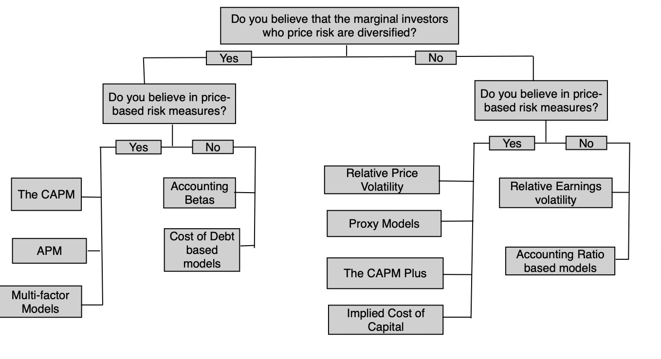 As you can see, the risk measure you choose will be a function of whether you (as an investor or business) believe that the marginal investors, i.e., the investors who own the most shares in your business and trade those share, are diversified or not, and what you believe about financial markets and accounting data.