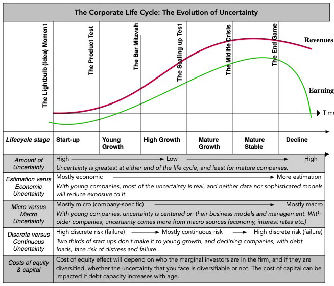 Once I have the costs of equity and capital for each firm, I compute industry averages, both for global firms, and by region (US, Japan, Europe, Emerging Markets, with India and China as sub-categories). You can find the links to the data at the end of this post, but there is another perspective that you can bring to the cost of capital discussion, based upon where a company falls in the company life cycle: