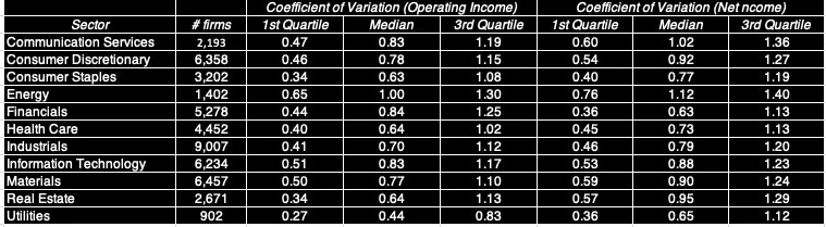 Let’s start with volatility in earnings, where we have two estimation choices that we must make, before we get started. The first is history, and I compute the standard deviations in operating and net income using ten years of earnings data, for each firm, a compromise between a number too high (where I lose too many firms in my sample) and too low (where I lack enough data). The second is that earnings standard deviations in earnings will reflect the level of earnings, with higher earnings companies having higher standard deviations. To control for this, I divide the standard deviation of earnings by the average earnings over the ten years, yielding coefficients of variation in earnings. The following table summarizes the distributional values for this metric, across sectors: