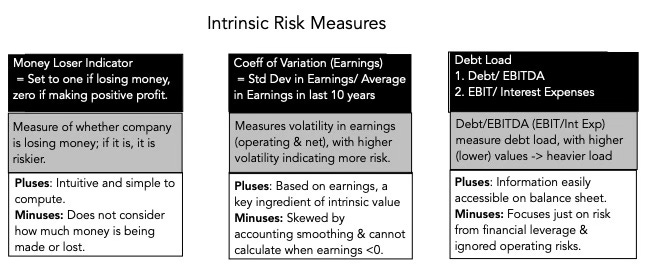 While there are some who use debt loads as proxies for company risk, and we will come back and look at differences across sectors and industries in a later post, it is a narrow measure, since a young, risky, high growth company with no debt would be classified as low-risk, if it is not debt-laden.