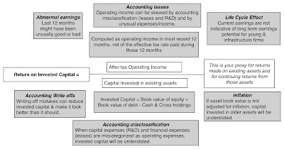 Note the caveats that I have added to the picture, listing the perils of trusting two accounting numbers: operating income and invested capital. I did try to correct for the accounting misclassifications, converting leases into debt and R&D into capital assets, and also computed an alternate return on capital measure, based on average earnings over the last ten years. Notwithstanding these adjustments, I am still exposed to a multitude of accounting problems and I have to hope and pray that the law of large numbers will bail me out on those.