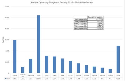 It is true that there are differences of opinion about how best to measure the cost of raising funds, but disagreements about the cost of capital are drowned out by disputes on how best to measure the returns that are generated by investing this capital. There are two widely used proxies for profitability. One is the profit margin, obtained by dividing the earnings by the revenues of the firm, and it can be estimated using either operating income (operating margin) or net income (net margin). Since the latter is a function of both the profitability of businesses and how much they have chosen to borrow, I will focus on operating margins and report on the distribution of both pre-tax and after-tax operating margin in the graph below: