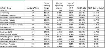In the second part of the analysis, I broke down the 41,889 companies into 95 industry grouping and computed the excess returns for each industry group. The full results are at this link, but I ranked companies based on the magnitude of the excess returns. Again, with all the reservations that you can bring into this measure of investment quality, the businesses that delivered the highest spreads (over and above the cost of capital) are listed below.