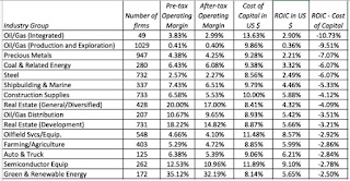 Note that oil companies are heavily represented on this list, not surprising given the drop in oil prices during the year. That, of course, does not make them bad businesses since a turning of the commodity price cycle will make the returns pop. There are other businesses that have been affected by either the slowing down of the China growth engine, such as steel and shipbuilding, and the question is whether they can bounce back if Chinese growth stays low. Finally, there are some perennially bad businesses, with auto and truck being one that has managed to stay on this list every year for the last decade, grist for my post on bad businesses and why companies stay in them.