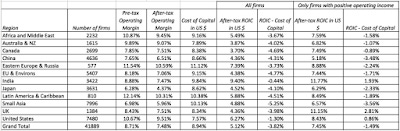 Are firms in some parts of the world better at putting capital to work than others? To answer that question, I broke my global sample into sub-regions and computed both operating margins and excess returns (return on invested capital, netted out against cost of capital) in each one.