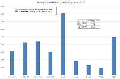 I computed the return on invested capital for each of the 41,889 firms in my sample and subtracted out the cost of capital for each one to arrive at an excess return. The graph below captures the distribution of this excess return across global firms in 2015: