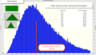 Since the narrative has not changed since the original IPO, the value per share for Twitter, not surprisingly, remains at about $18. The results of my simulation are below: