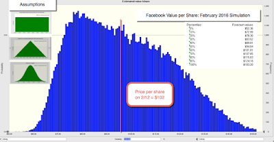The value per share that I get for the company, with this narrative, is about $95/share, just a little bit under the $102/share that the stock was trading at in February 2016. As with my other valuations in this series, I ran a simulation of Facebook’s value and the results are below: